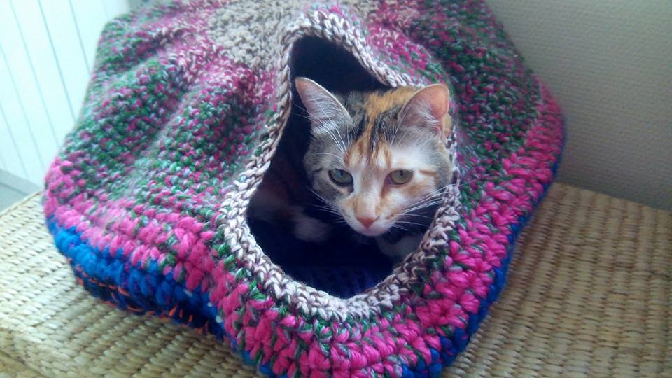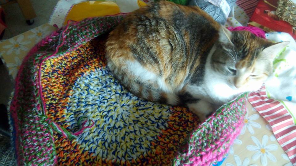 Con todas las sobras de lanas que tengo, (que no son pocas), le he hecho a Xera (mi gata) una camita en la que está tan calentita, agusto y refugiada...